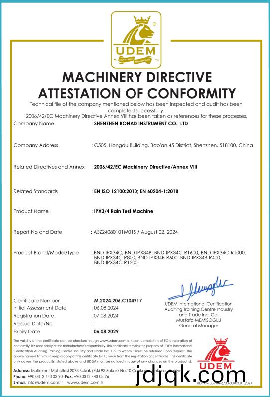 MACHINERY DIRECTIVEATTESTATION OF CONFORMITY for IPX3/4 rain test machine